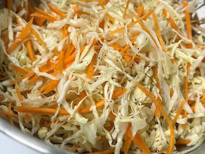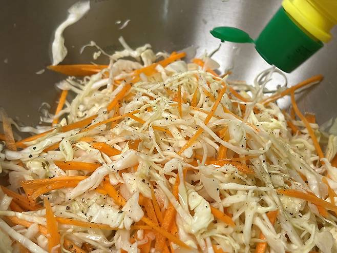 소금으로 살짝 절여 숨이 죽은 양배추에 후추를 약간 뿌려주면 은은한 향이 더해져 샐러드의 풍미가 훨씬 살아납니다. 가루 후추보다는 통후추를 갈아서 쓰는 게 더 좋습니다.