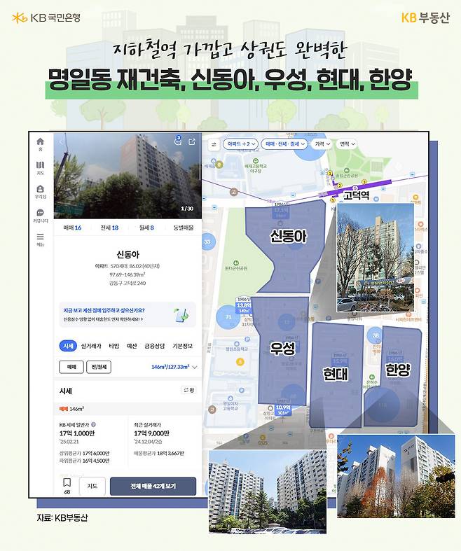 서울지하철 5호선 고덕역 남쪽에는 강동경희대병원과 강동아트센터, 이마트(고덕점)을 비롯, 각종 은행, 식당, 학원 등 다양한 상권이 잘 형성돼 있습니다. 이 상가 주변으로 500여 가구 규모의 4개 단지가 위치해 있는데요. 모두 1986년 입주한 40년된 아파트들입니다. 명일동 신동아, 우성, 현대, 한양은 전용 84㎡부터 133㎡까지 중대형 타입 위주로 구성돼 있고 대지지분도 비슷합니다.