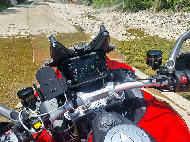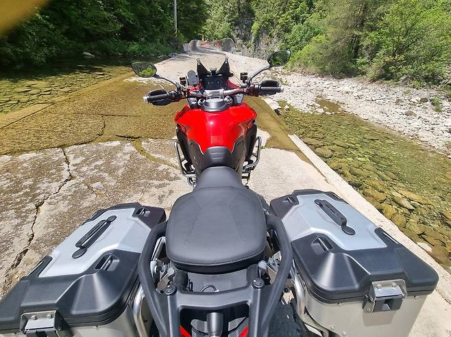 이틀째에는 비가 쏟아졌다. 여름 장마비 같았다. 하지만 핸들 열선 그립과 시트 열선 덕분에 전혀 춥지가 않않았다. 주행모드를 레인으로 바꾸니 타이어 역시 미끄러짐이 없어 마음껏 스로틀을 사용할 수 있었다. 170마력이라고 해서 울컥거리며 미친듯이 튀어나가는 느낌이 없다는 건 정말 큰 장점이었다. 우아한 라이딩이란 이런 게 아닌가 싶었다. 비가 올 때는 바이크는 안 타는 게 최선이라고 생각했는데, 멀티스트라다 V4랠리는 그런 고정관념을 깨기에 충분한 녀석이었다.