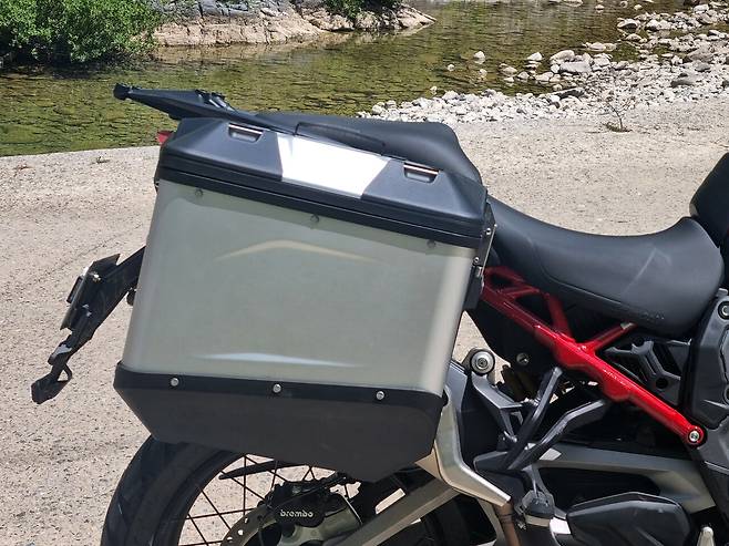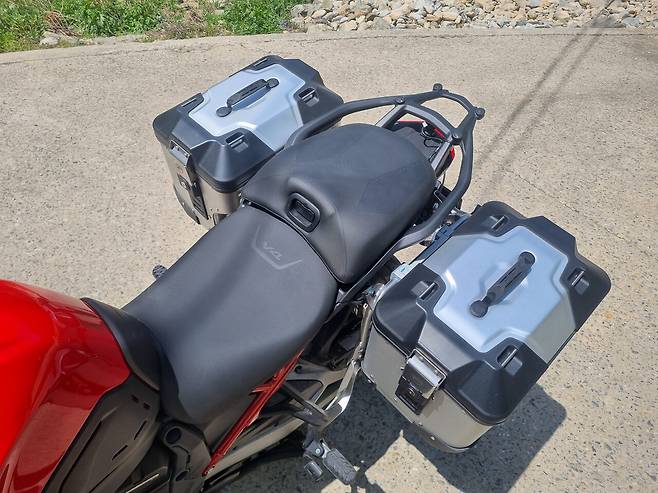 고속 코너링도 압권이었다. 평소처럼 코너를 돌아가다가 속도를 보니 내 생각의 2배 속도였다. 스콜피온랠리STR 타이어의 접지력과 역회전 크랭크샤프트가 만들어내는 가벼운 핸들링 덕분에 건조중량 240kg, 사람과 짐까지 합쳐 350kg에 가까운 바이크를 너무나 가볍게 조정할 수 있었던 것이다.