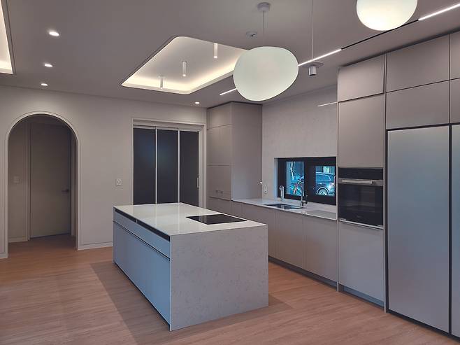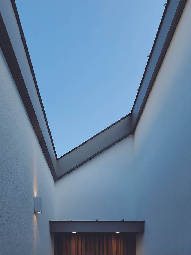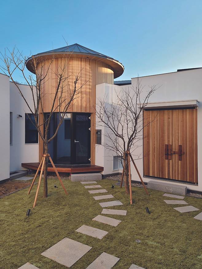 외관 곳곳에 설치한 백색 알루미늄 루버가 빛을 만나면 그림자를 통해 연회색으로 변하는 것을 볼 수 있다. 따뜻한 목재로 마감한 원형 다실은 경직된 물성과 형태를 순화하며 이 집을 지탱하는 구심점이 된다.