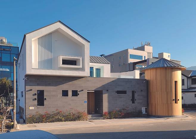 주 출입구를 배치한 남쪽 도로에 옥외 주차 2곳을 두고 남은 대지에 1층을 계획했다. 형태는 사생활 보호와 소음을 차단하기 위해 ‘ㅁ’자가 됐다. 2층은 일조와 전망을 고려해 ‘ㄱ’자 형태로 앉히게 됐다. 주차장이 있는 건물 측벽에는 전기차 충전 시설도 마련했다.
