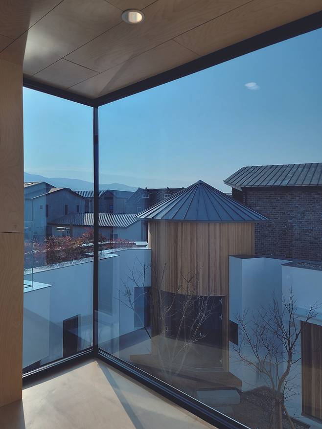 포치에서 현관 그리고 거실, 주방, 안방을 차례로 순환하다 보면 소담한 원형 다실에 도착한다. 다실은 자연을 느끼며 차를 마시고 때로는 나를 찾는 사색 공간을 제공하기도 한다. 실내에는 두 곳의 중정이 있다. 1층 현관에 들어서면 오죽과 빛으로 가득한 공간이 사람을 반기는데 이 대나무 잎사귀는 2층 침실에서도 볼 수 있다.