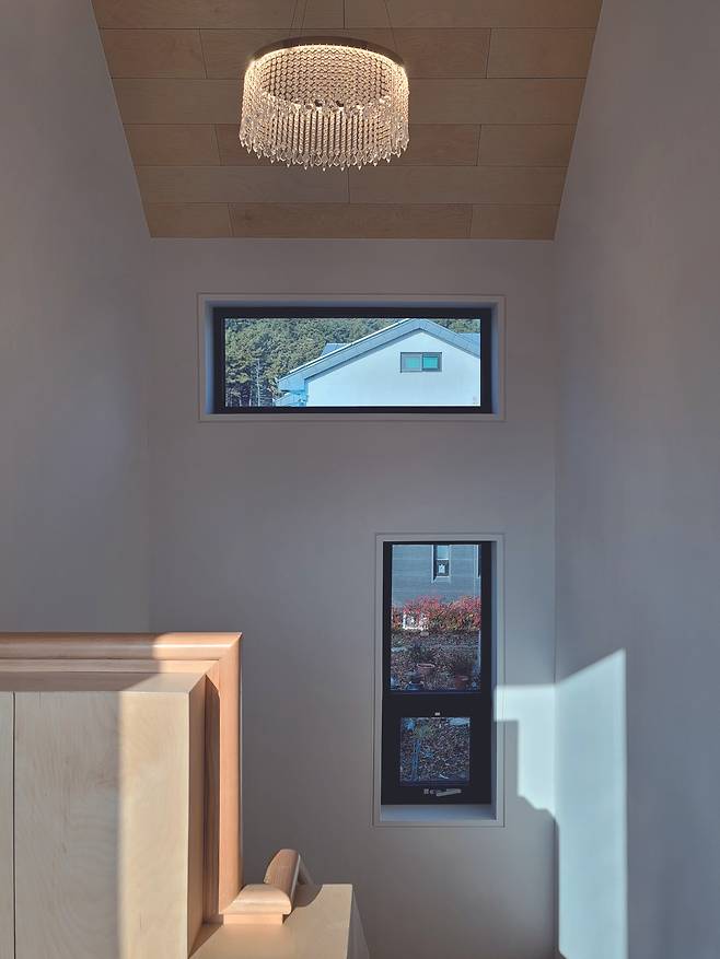 ‘ㄱ’자 형태인 2층은 복도 창을 시원하게 계획했는데 복도를 걸으면 앞산과 마을 풍경이 한눈에 들어온다. 한쪽에는 창을 좀 더 돌출시키고 바닥을 의자 높이로 만들어 걸터앉기 쉽게 윈도우시트로 디자인했다. 차를 한 잔 마시기에 안성맞춤인 곳이다. 각 침실에는 테라스를 연계해 개인 공간에서 빛, 비, 바람과 같이 자연을 가까이하도록 조성했다. 그중 동쪽 테라스에는 디자인 벽을 세우고 고정식 붙박이 의자를 마련해 프라이버시를 확보했다.최종 마감재는 원칙대로 도배지와 자연 소재를 사용했다. 기후를 통한 습도 조절과 건강을 위한 의학적 고려에 근거한다. 안방 침대가 놓인 벽, 다이닝룸 벽 그리고 2층 복도와 계단실 천장은 자작나무 합판을 적용하고 나머지는 도배지로 마감했다.