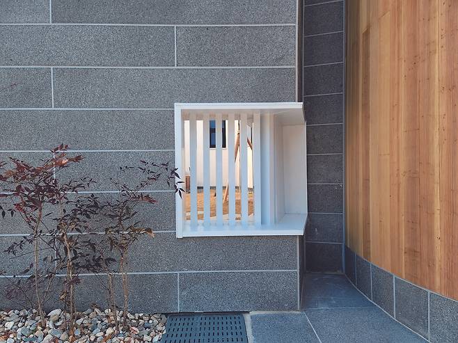 외관은 1층 화강석의 수평선이 안정감을 주면서 층고 높은 원형 다실과 2층 박공지붕이 수직선을 강조하며 조화를 이룬다. 주조색은 1층과 2층을 각각 짙은 회색, 백색으로 계획해 대비를 줬다. 이질재인 화강석과 다실의 목재 마감은 매스를 분절함으로써 그림자가 깊이를 더한다.