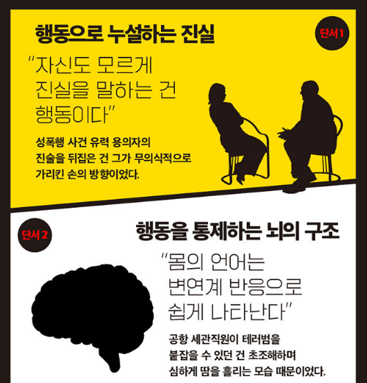 진실한 감정과 의도를 포착하려면 어디를 봐야할까? 위협을 느낄 때 가장 먼저 반응하는 신체 부위는 어디일까? 앉아 있는 자세를 통해 상대의 불편한 마음을 눈치 챌 수 있다고? 인간은 자기도 모르는 사이에 끊임없이 몸짓과 표정으로 수천 가지 신호를 보낸다.