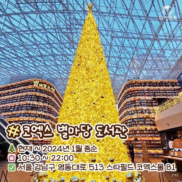삼성 스타필드 코엑스몰 B1에 위치한 별마당도서관에 올해도 황금빛의 대형 트리가 밝았습니다. 추위로 인해 대형트리 스팟을 찾아가기 어렵다면, 코엑스에서는 실내 대형트리로 크리스마스 분위기를 만끽할 수 있습니다.