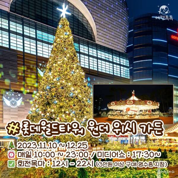 롯데월드타워 크리스마스 ‘원더 위시 가든’은 10시에 오픈해 23시까지 운영되며 트리 점등 등 미디어 쇼는 17시 30분부터 23시까지 연출됩니다. 크리스마스 회전목마는 12시부터 22시까지 운영합니다.