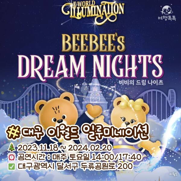 매주 토요일 14:00과 17:40에는 '비비의 드림 나이츠'라는 테마의 공연이 진행됩니다. 축제 시작일인 11월 18일 19:00에는 일루미네이션 점등식 'Eworld Lights Up'이 함께 진행됩니다.