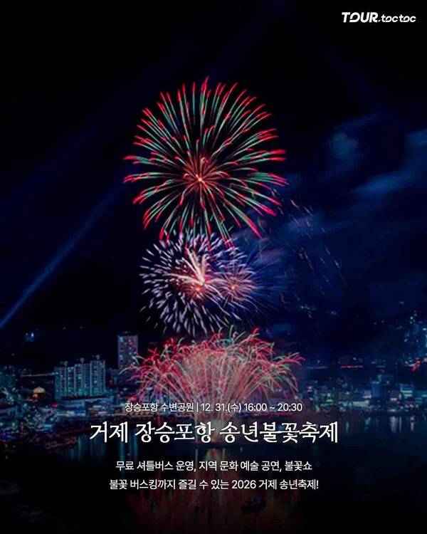 거제 장승포항 수변공원에서는 12월 31일 오후 4시부터 8시 30분까지 열리는 송년불꽃축제가 장식합니다. 바다 위에서 터지는 불꽃과 함께 지역 예술 공연, 버스킹, 무료 셔틀버스가 마련되어 가족 단위 방문객도 편리하게 참여할 수 있습니다.