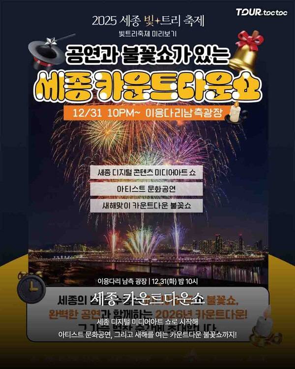 세종 이응다리 남측 광장에서는 12월 31일 밤 10시부터 세종 카운트다운쇼가 열립니다. 세종빛트리축제와 연계되어 디지털 콘텐츠 미디어아트 쇼, 아티스트 문화공연, 불꽃쇼 등이 함께 진행되어 가족·친구와 함께 즐길 수 있는 전국축제이자 멋진 카운트다운 보는 곳입니다.