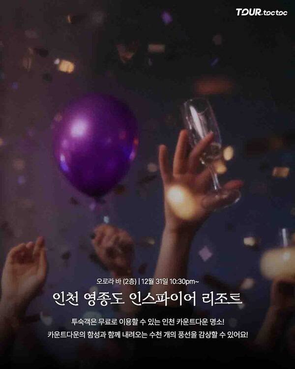 인천 영종도에 위치한 인스파이어 리조트의 2층 오로라 바에서는 12월 31일 밤 10시 30분부터 리조트형 카운트다운 파티가 열립니다. 투숙객은 무료로 참여 가능하며 풍선 퍼포먼스와 함께 하는 이벤트가 특징입니다. 후기에서는 바다와 리조트 야경을 동시에 즐길 수 있는 숨은 카운트다운 보는 곳이라는 평가가 많으며, 음악과 파티 분위기를 즐기고 싶은 여행객들에게 추천하는 카운트다운 명소입니다.