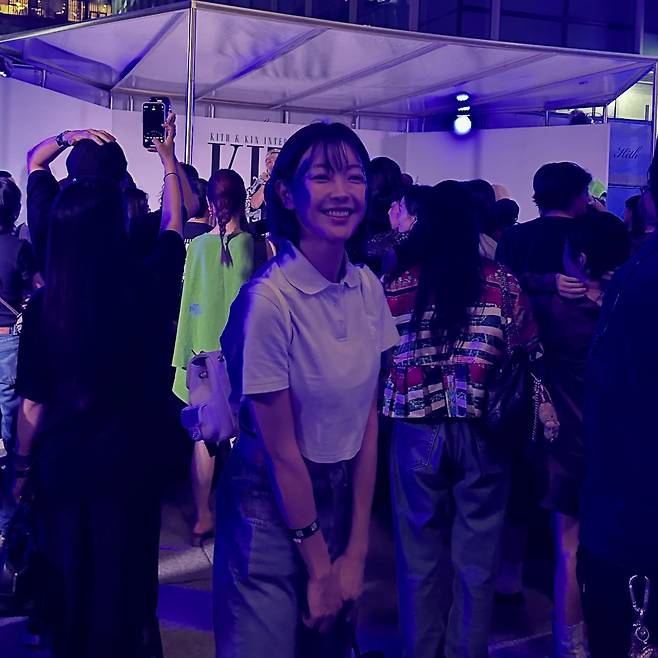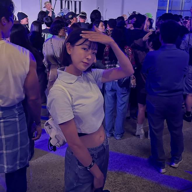다른 자리에서는 화이트 크롭 폴로 셔츠와 와이드 데님 팬츠로 분위기를 전환했어요.