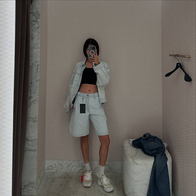 밝은 톤의 데님 셋업에 블랙 크롭톱을 매치한 룩은 캐주얼하면서도 힘 있는 실루엣을 완성했어요.