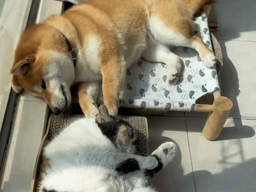 낮잠을 잘 때에도 고양이와 개는 서로 가까이에 자리를 차지하고 있습니다. 이번에도 역시 시바견은 고양이에게 자신의 앞손을 내밀어 털을 만지며 잠이 들었습니다.