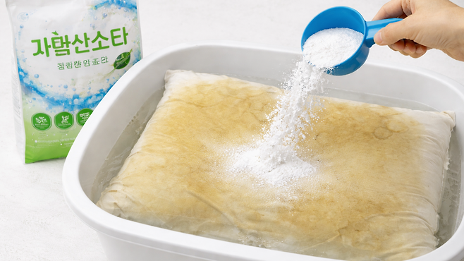 전처리 시에는 과탄산소다를 온수에 풀어 함께 활용하면 산화 작용이 더해져 오염 분해가 한층 수월해진다.