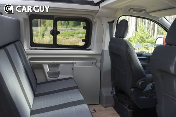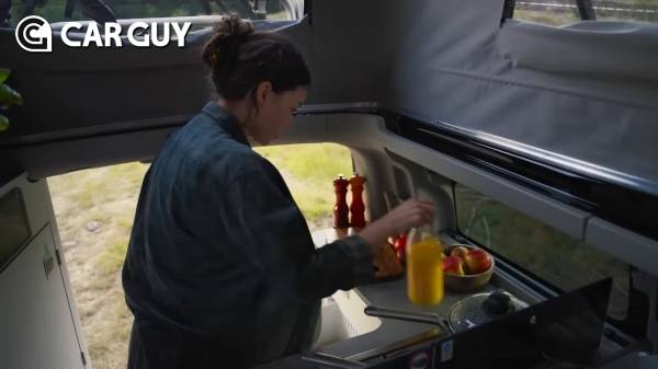 캠핑용 주방은 트랜짓 커스텀 너겟의 후면에 L자형 레이아웃으로 탑재했다. 서랍식 냉장고, 가스레인지, 싱크대가 기본으로 내장되어 있으며 1세대보다 조리대 공간이 20% 넓어졌다.