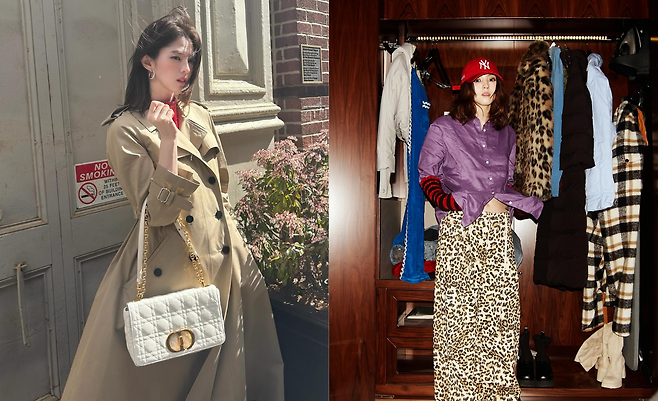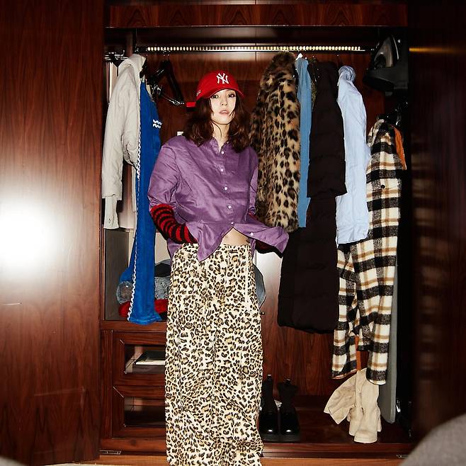 한소희가 뉴욕 양키스 레드 캡과 퍼플 셔츠, 레오파드 패턴 와이드 팬츠를 매치한 과감한 믹스매치 룩을 선보이고 있다. 클로젯 앞에서 포착된 이 스타일은 스트라이프 소매 디테일이 돋보이는 퍼플 셔츠와 애니멀 프린트 팬츠의 대담한 조합으로 한소희만의 개성 있는 패션 감각을 드러내고 있다. 캐주얼하면서도 트렌디한 이 스타일링은 일상 속에서도 패션 아이콘으로서의 면모를 잃지 않는 배우의 스타일 철학을 엿볼 수 있게 한다.