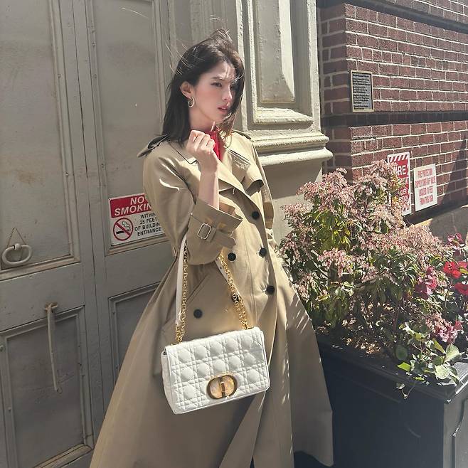 한소희가 베이지 트렌치코트를 입고 도시적인 분위기를 자아내고 있다. 더블 버튼 디자인의 클래식한 트렌치코트에 레드 포인트 아이템을 매치해 세련된 스트리트 패션을 완성했다. 화이트 컬러의 디올 카나주 패턴 숄더백을 골드 체인 스트랩과 함께 매치하여 럭셔리한 감성을 더했다. 트렌치코트의 벨트 디테일이 허리라인을 강조하며 여성스러운 실루엣을 만들어내고 있다.
