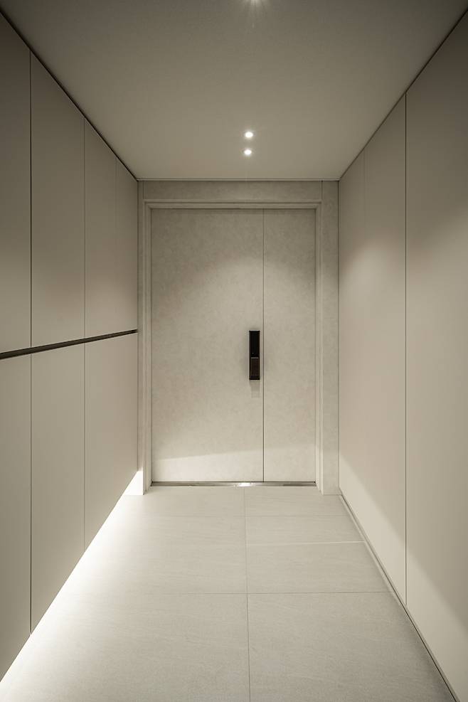 현관은 집의 첫 이미지인 만큼 저희 집과 어울리게 밝고, 깔끔한 느낌으로 만들었어요. 최대한 신발을 많이 수납할 수 있도록 했고 600각의 타일을 써서 넓어 보이도록 연출했어요.