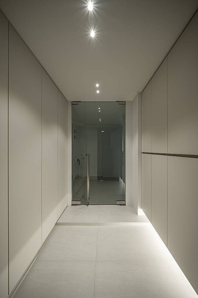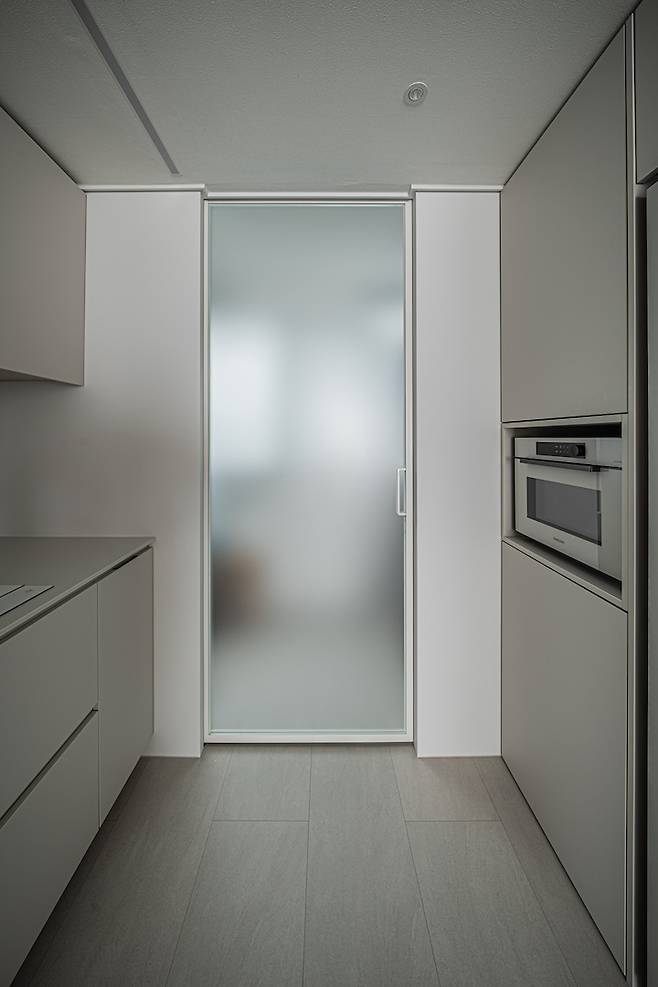 중문은 개방감 있는 비대칭 양개형 유리 중문을 사용했는데, 평소에는 메인 문만 사용하고 큰 짐 나를 때는 반대쪽도 열 수 있어 실용성까지 갖췄답니다. 손잡이가 아래쪽에 있어 더 포인트가 되는 거 같아요.