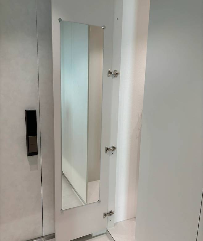 외출할 때 신발 뭐 신어야 하나 고민하는 거 저 뿐인가요? ^^ 옷이랑 어떤 신발이 어울리는지 꼭 거울로 확인해야 하는데 유리 도어는 싫어서 펜트리 문 안쪽에 거울을 달아주었어요.