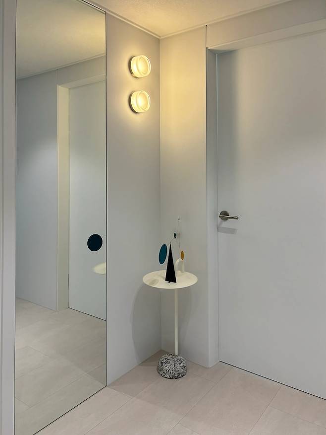 현관 바로 앞에는 사장님께서 데일리룩 찍을 수 있는 거울과 베르몬드등을 포인트로 달아주셨어요. 조명 밑에는 밋밋하지 않도록 hay의 사이드보울과 볼타 모빌로 꾸며주었습니다.