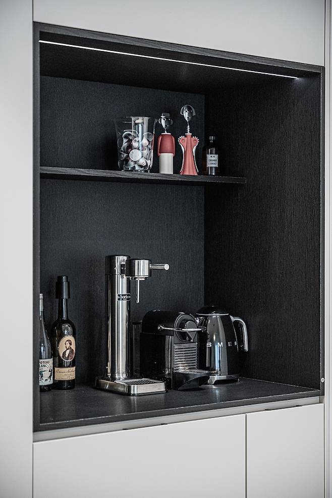 저희 집 포인트 컬러가 블랙이라 홈바 색도 남들 잘 안 하는 칼프 블랙 우드로 넣었어요. 집에 오시는 분들마다 생맥주 기계로 착각하시는 저 아이는 아르케의 탄산수 메이커입니다! 플라스틱 쓰레기도 안 나오고 탄산 강도도 아주 세서 만족도 10000%예요! 홈바는 앞으로 차차 채워나가려고요.