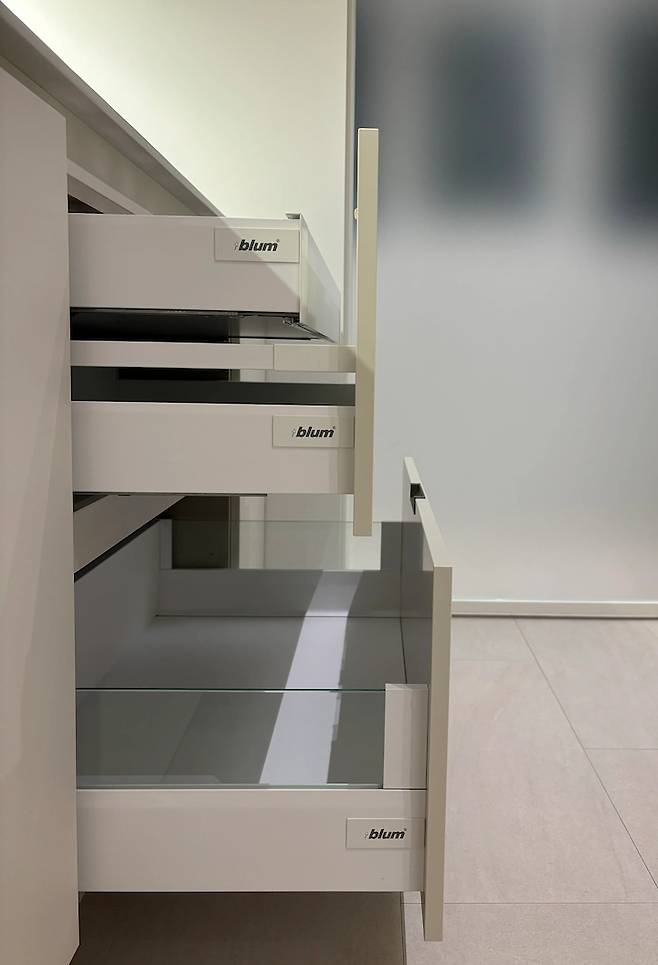 가구 하드웨어는 모두 블럼입니다. 인티보 라인인데도 부드럽게 열고 닫히는 게 최고예요. 제값을 하는 친구입니다.