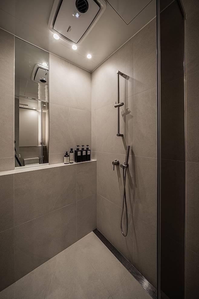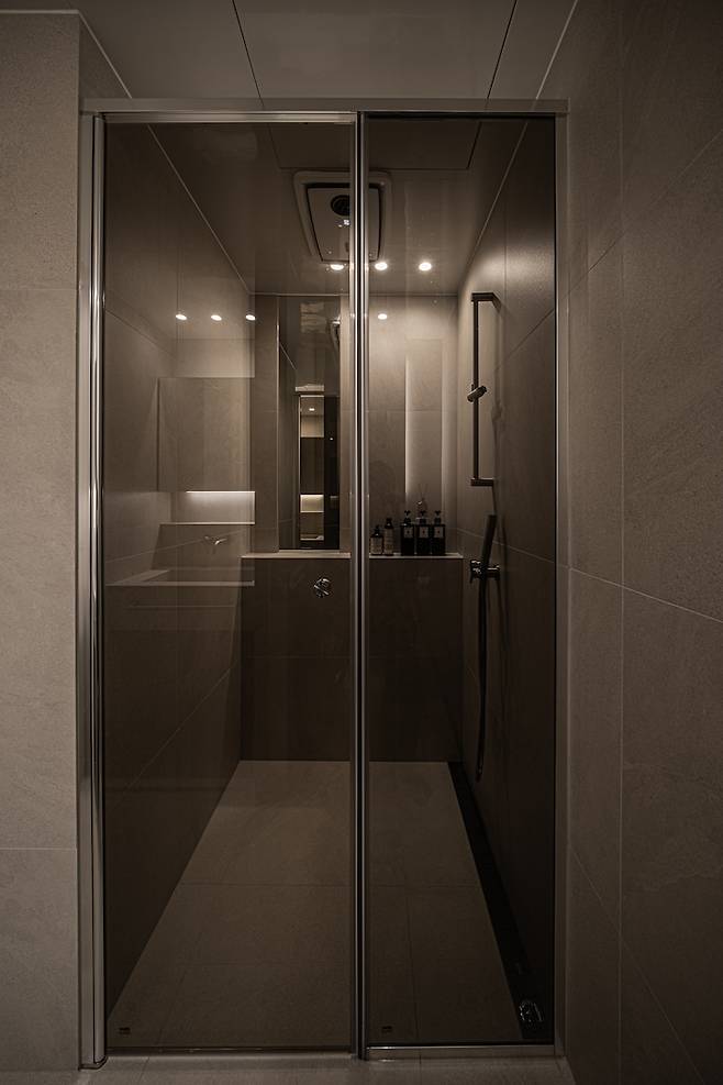 샤워부스는 타일 색상과 어울리는 색상의 유리문을 달았고, 젠다이를 만들어 위에 샤워 용품들을 올려두고 사용하고 있어요. 트렌치 유가는 매립 수전이랑 잘 어울리기도 하고 물도 잘 빠져서 만족스럽게 사용 중입니다.