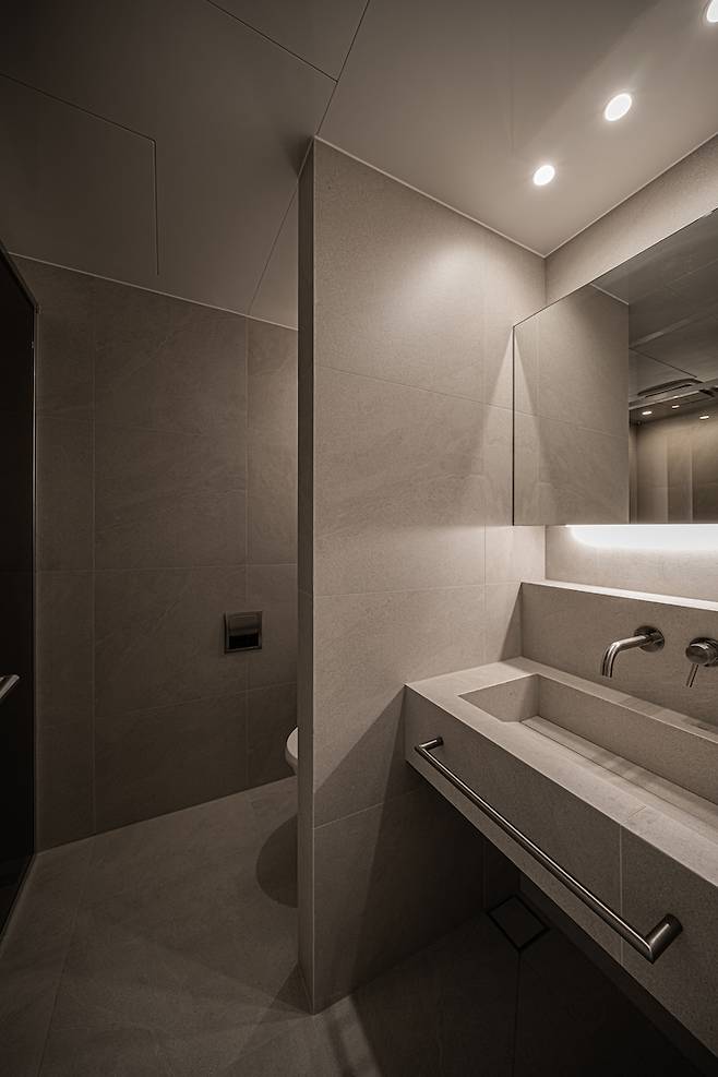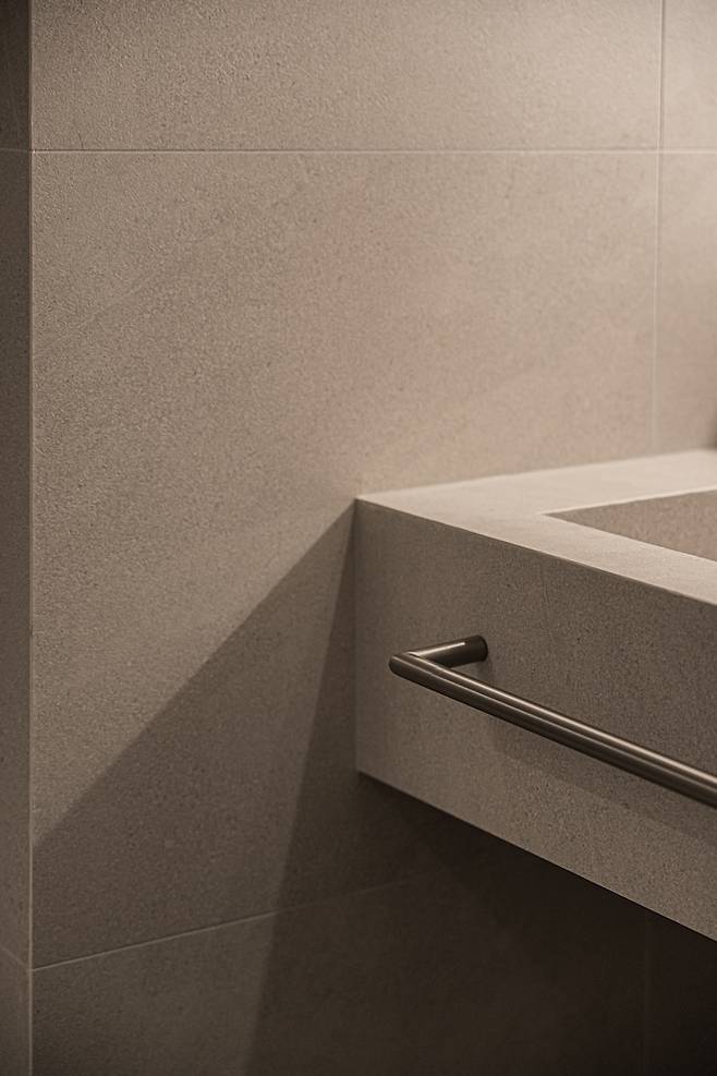 화장실에서 고급스러움 느낌을 주려면 큰 사이즈의 타일만큼이나 중요한 게 졸리컷 시공인 것 같아요. 레진으로 마감까지 해서 하나도 날카롭지 않아 나중에 아이도 잘 사용할 것 같아 만족도가 큽니다.