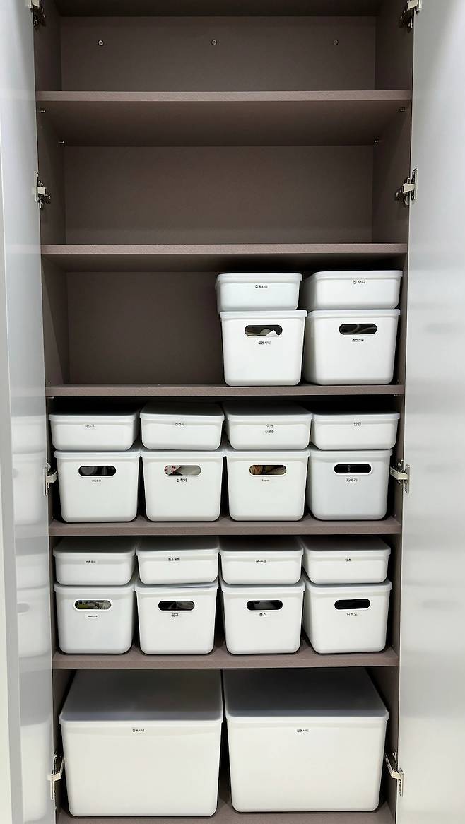 문을 열면 어디에 뭐가 들어가 있는지 알아보기 쉽게 팬트리 정리함을 이용해서 정리해두었어요. 그리고 정리함마다 라벨지를 붙여두었어요. 집에 라벨기 하나 사두시면 정말 편리합니다:)