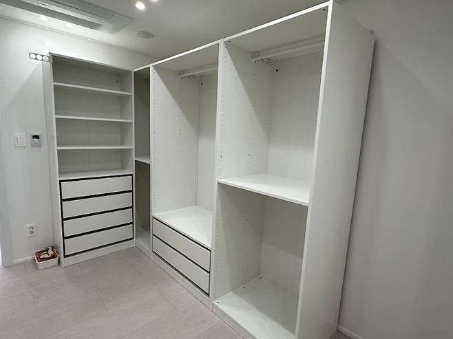여러 후기를 읽어 보고 셀프 조립은 어렵다 판단되어 조립 서비스를 신청했는데, 조립도 각 제품 별로 선택이 가능해서 큰 몸통과 서랍만 신청하고 나머지 선반과 옷장 레일은 셀프로 달았습니다. 큰 몸통은 꼭 조립 서비스 맡기시고 나머지는 다 셀프로 해도 될 것 같아요.