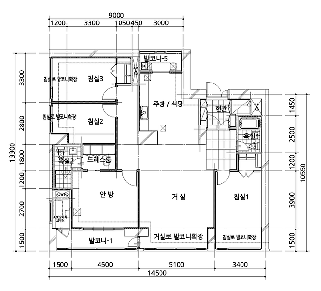 저희 집은 올해로 17년 된 주상복합 아파트로 방 4개, 화장실 2개로 이루어져 있어요. 안방 제외하고는 다 확장 공사가 되어 있는 상태였습니다.