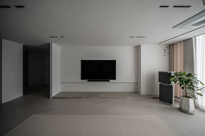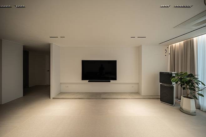 TV는 원래 가지고 있던 75인치를 반매립 시공했어요. 매립을 하면 더 깔끔하겠지만 인치 업그레이드할 것을 감안하여 반매립을 택했습니다. 라인 정리를 위해 좌측에는 가벽을 세우고 아래에는 타일로 포인트를 주었어요.
