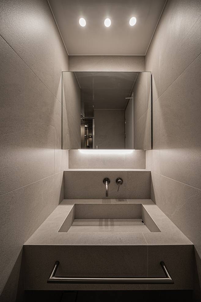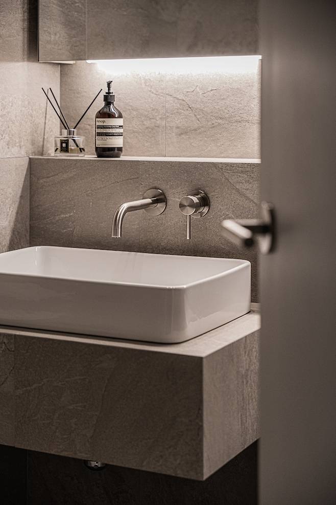 손님들도 사용하는 곳이니 욕조가 보이지 않도록 조적 파티션을 세웠습니다. 그리고 탑볼 세면대에 무광 매립 수전, 저도 넣어봤어요:)