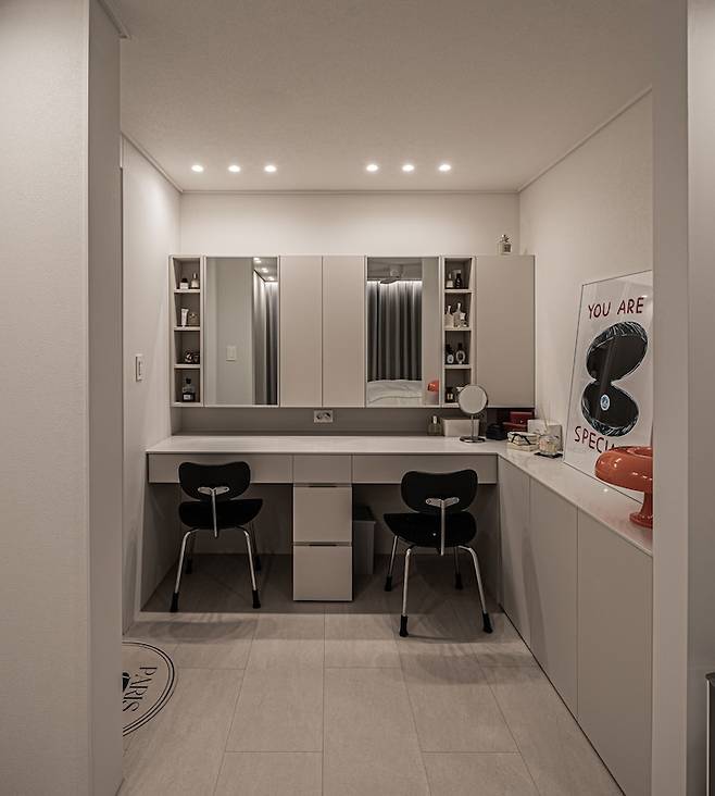 외출 준비할 때 남편도 시간이 꽤 걸리는 편이라, 같이 옆에 앉아 준비하기 위해 남편 자리가 필요했어요. 또 기초 케어 제품에 먼지 앉는 걸 극도로 싫어해서 상부장도 필수였습니다. 그리고 서서 화장을 하기엔 제 부실한 하체가 힘들어해서 의자도 넣어야 했습니다. 저희 요구 사항이 가장 많았던 곳이에요.