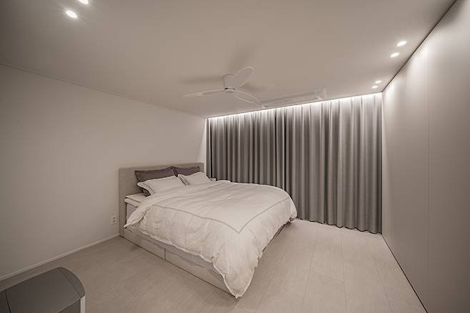 저희에게 침실은 정말 잠만 자는 곳입니다. 수납공간이 부족했기 때문에 무몰딩 붙박이장을 시공했고, 파우더룸으로 들어가는 문이 너무 좁아 아예 문을 없애고 벽을 허물었어요. 다들 극찬하는 실링팬은 궁금해서 안방에 시공해 보았습니다. 아직 써본 적은 없어요. ^^;
