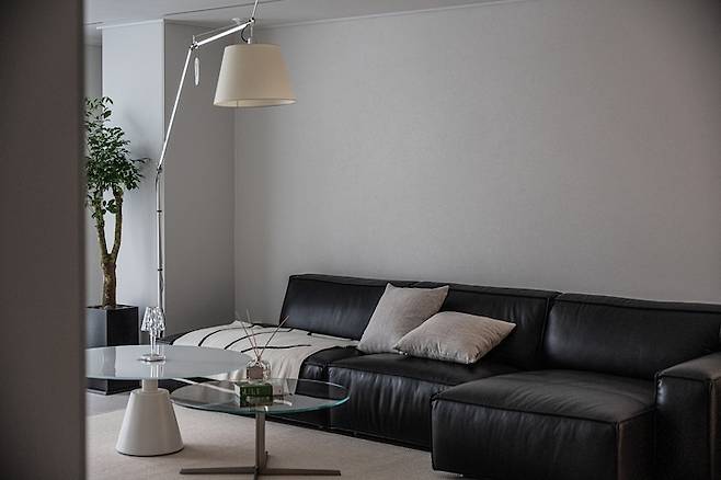 소파 테이블은 쇼룸에서 보고 반한 보컨셉의 마드리드와 세비야 테이블 두 개를 높이 다르게 하여 배치해 두었어요. 플로어 조명은 많이들 보셨을 바로 그 아르떼미데 톨로메오입니다.