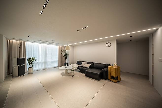 우물천장도 일면화했더니 제가 원하는 깔끔 그 자체로 표현되어 만족스러워요. 시스템 에어컨 뒤에도 원하는 위치에 조명 넣을 수 있게 작업해 주셨어요. 창 쪽에도 테이블을 놓고 조명을 달 예정입니다:)