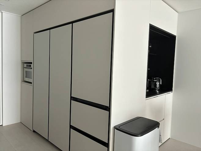 싱크대 색상도 고민이 많았는데, 고심 끝에 고른 포그 그레이 색상이 사하라 라이트와도 삼성의 코타 화이트 색과도 너무 잘 어울리네요. 지문 방지도 돼서 깔끔하게 유지하기도 좋아요.