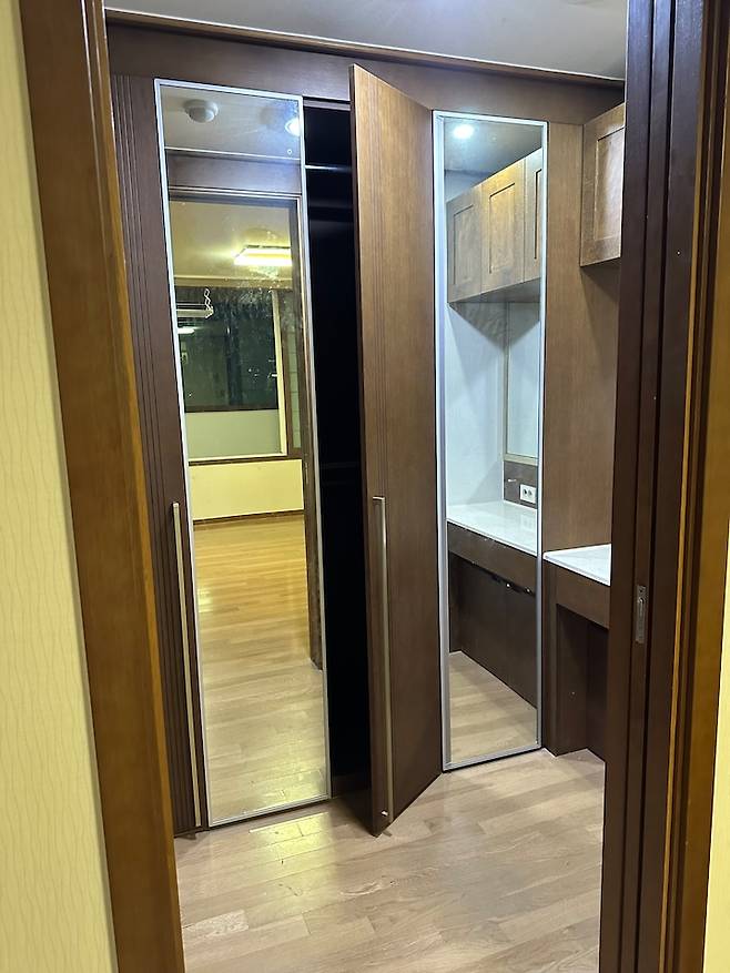 벽을 허물고 만든 파우더룸입니다. 인테리어 하기 전에 레퍼런스 찾는다고 인스타그램부터 핀터레스트까지 많이 뒤져봤지만 좌식인 2인용 파우더룸은 없더라고요. 그래서 사장님과 고민 끝에 만든 화장대입니다.