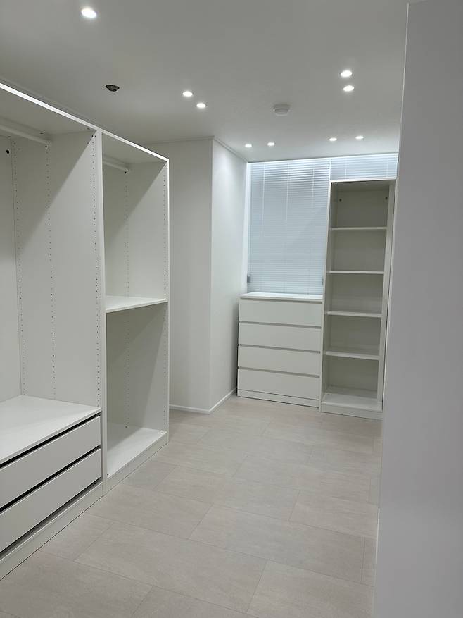 드레스룸에는 블라인드를 시공하고, 환기를 위해 창문 밑에는 국민 서랍장 말름을 넣었습니다. 스타일러 자리로 61cm를 남겨두었는데, 정말 딱! 맞게 들어갔어요. ㅎㅎ