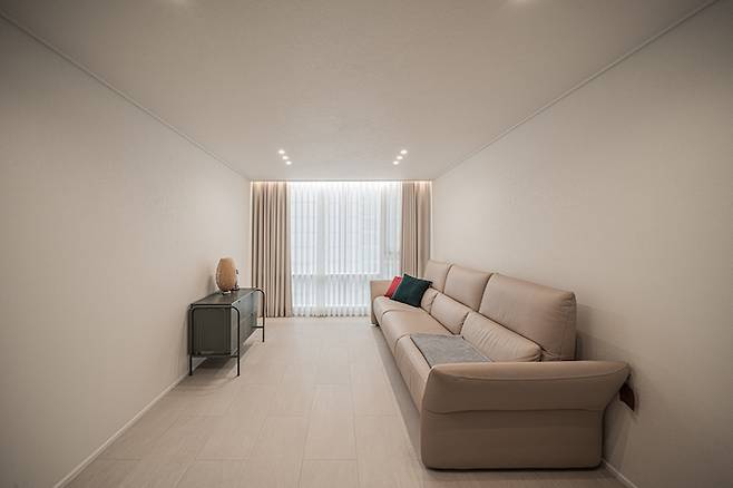 짠! 현재는 이렇게 신혼부부의 거실로 바뀌었어요:) 공용부는 도배와 필름 마감이 섞여 있는데, 디아망 퓨어 화이트와 필름 색이 조화를 잘 이루어서 이질감이 전혀 느껴지지 않아요. 바닥은 동화 마루 나투스진 그란데 사하라 라이트입니다.