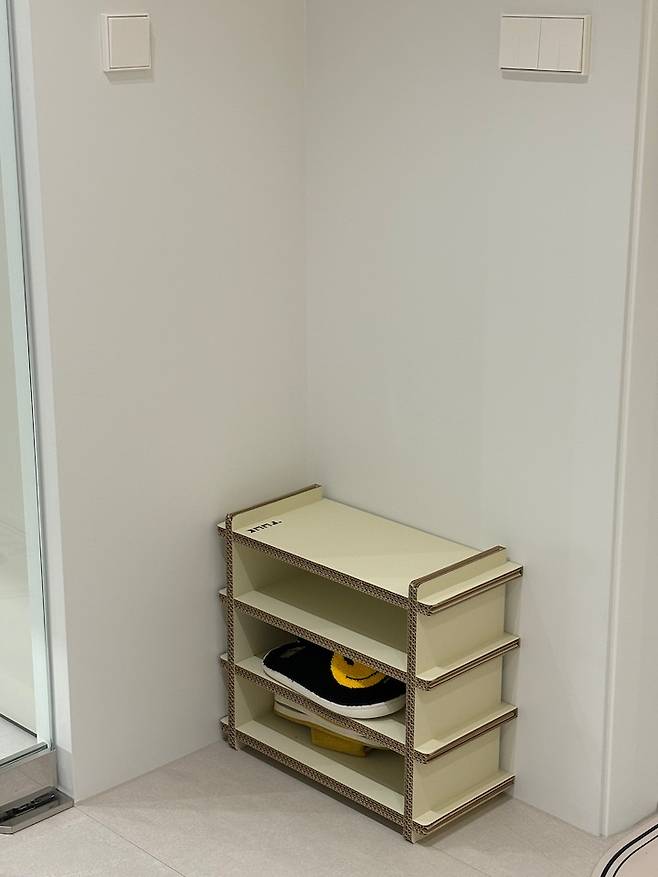 입구 쪽에는 손님들용 신발을 구비해두었는데, tuuk에서 만든 종이 선반을 신발장으로 사용하고 있어요:) 튼튼하고 이쁜데 지구까지 생각한 가구라니, 너무 멋진 것 같아요.
