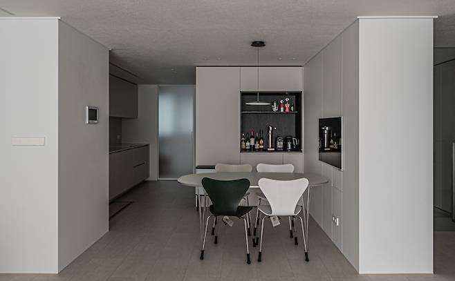 비포의 모습이 전혀 생각나지 않을 정도로 깔끔해진, 집에서 가장 많은 시간을 보내는 주방 겸 다이닝 공간입니다. 인테리어 전에 미리 사둔 프리츠한센 테이블과 세븐 체어인데, 마치 한 세트처럼 잘 어울리지 않나요?