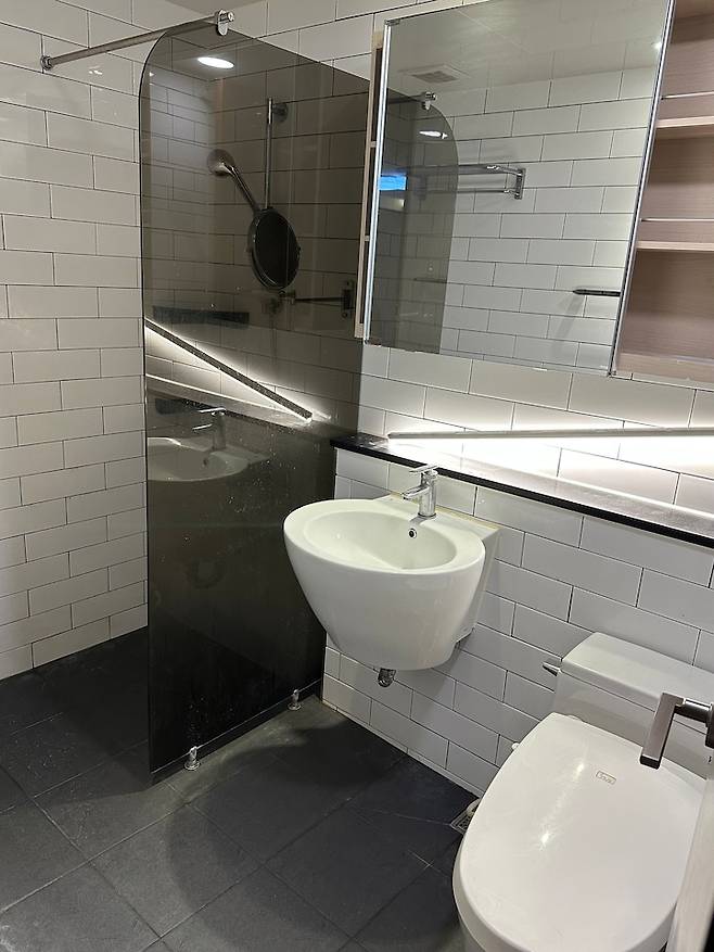 내욕실에는 두 개의 환풍기가 있는데, 하나는 변기 위에 있고 또 다른 하나는 샤워부스 안에 있는 휴젠뜨입니다. 샤워부스 밖은 건식으로 사용 중인데, 샤워하고 휴젠뜨 키면 금방 뽀송해져서 물 묻힌 채로 밖으로 안 나갈 수 있어서 너무 좋아요:) 사장님 추천으로 매립한 거울은, 저보다 남편이 더 좋아하며 사용 중입니다.