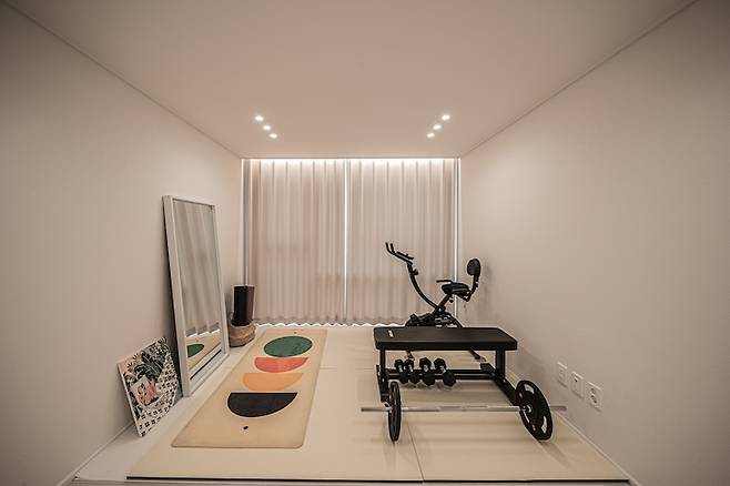 복도 맨 끝 방은 현재 제 운동방으로 사용하고 있어요. 마루 상할까 싶어 전지와 부직포 깔고, 그 위에 EDTC의 블랙 스퀘어를 깔아주었습니다.