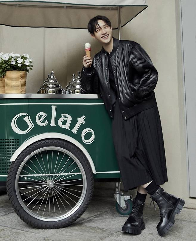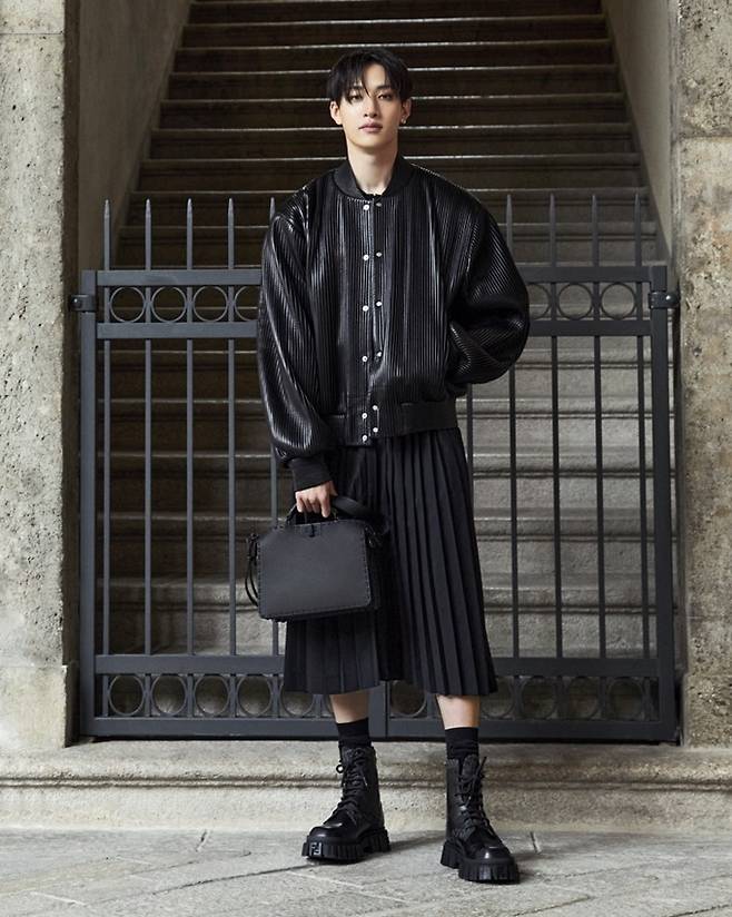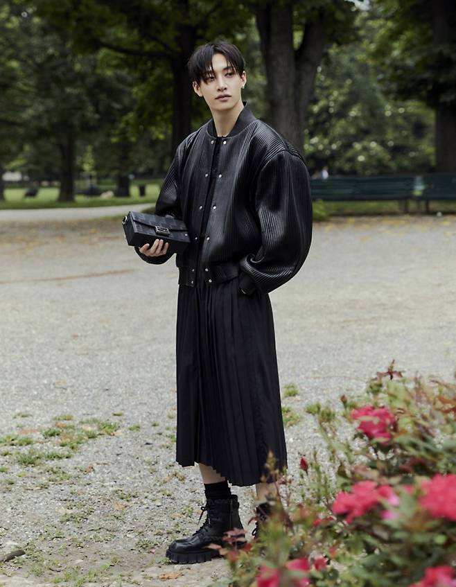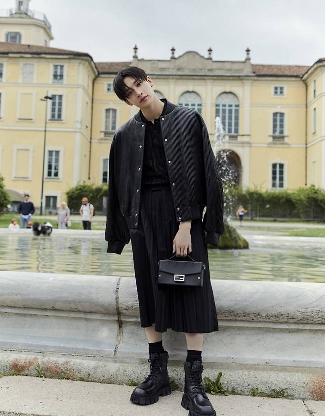 스틸 이미지 속 방찬은 펜디 2024 F/W 남성 컬렉션의 보머 재킷과 큐롯 팬츠를 매치해 젠더플루이드 스타일링을 선보이며 눈길을 끌었다.