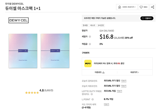 주요 면세점 마스크팩 카테고리 부동의 1위, '듀이셀 프라이빗 케어 마스크'. 1일 1팩을 할 필요 없는 고기능성 팩으로 주 1회만 해주어도 피부 에너지를 풀 충전할 수 있는 마스크팩으로 알려져 있다.